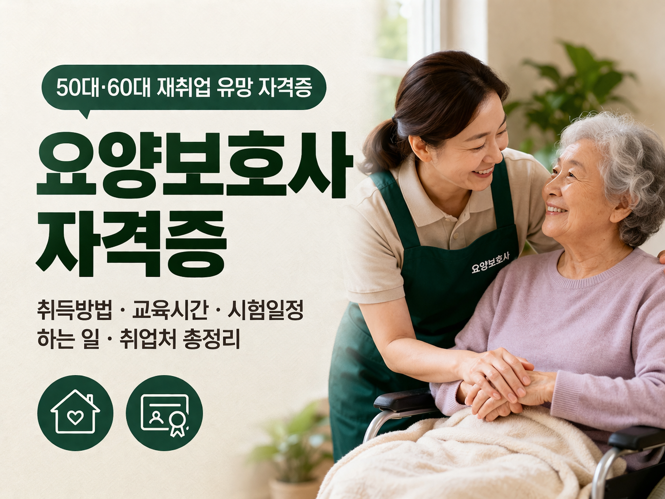 요양보호사 자격증이 무엇인지, 취득방법, 교육시간, 2026년 시험일정, 하는 일, 취업처까지 한 번에 정리했습니다. 50대 60대 재취업 자격증을 찾는 분이 꼭 알아야 할 핵심 정보만 쉽게 설명합니다.